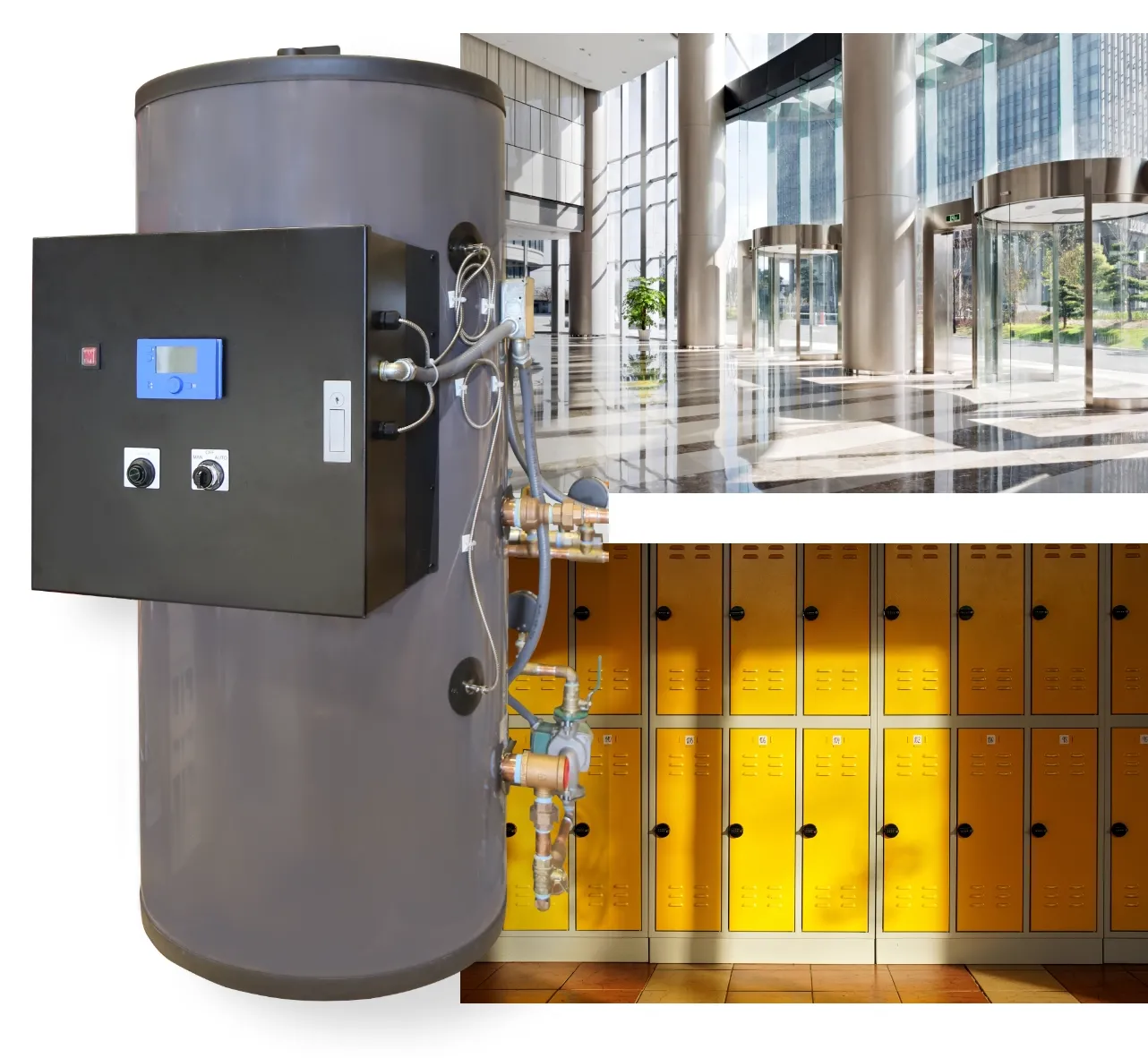120-400 gallon capacity gallon capacity water heater utilizing low-temperature boiler water, recovery from 0–3,660 GPH