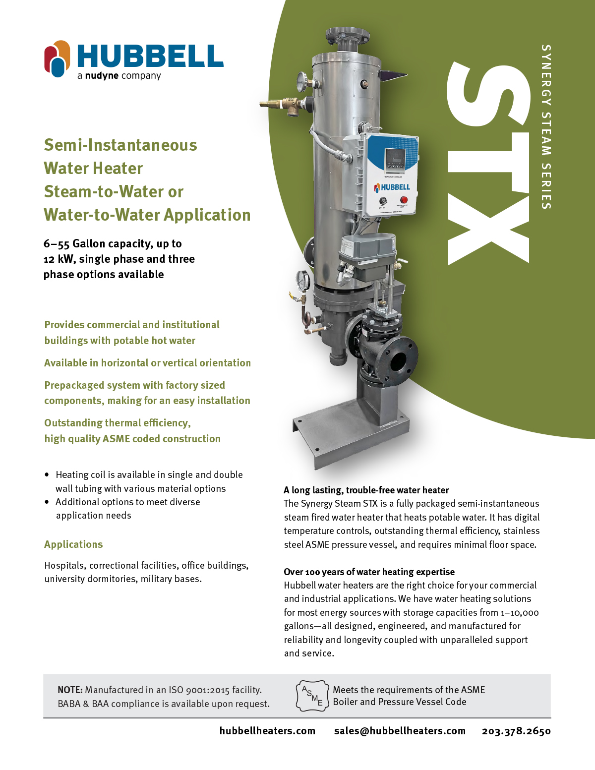 Used for steam water heating applications where: • There is a constant draw of hot water (minimum 10% of design flow) • Building recirculation loop For applications which do not meet this criteria, refer to the Hubbell ST storage steam heater. This will prevent overheating in the system and more consistent temperature of hot water coming from the heater.